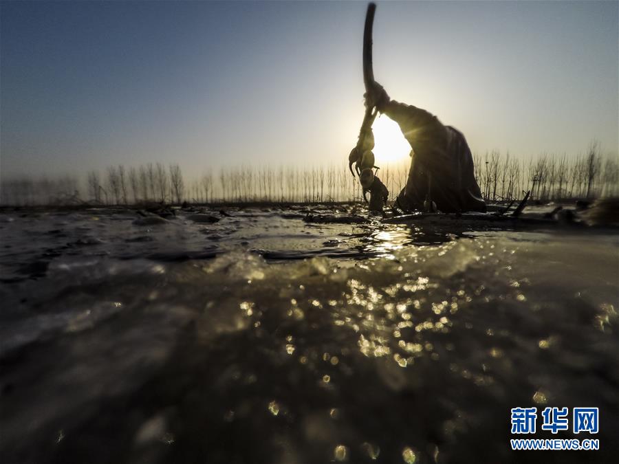 1月31日,在雄安新區(qū)安新縣東向陽(yáng)村的一處藕塘,一名挖藕工在水里工作。新華社記者沈伯韓攝