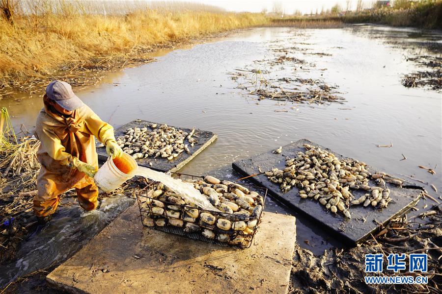 11月18日,工人在采收蓮藕。初冬時(shí)節(jié),河北省唐山市曹妃甸蓮藕豐收,工人們?cè)诮Y(jié)冰之前忙著采收蓮藕。新華社記者邢廣利攝