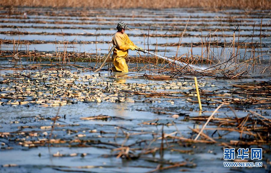 11月18日,工人在采收蓮藕。初冬時(shí)節(jié),河北省唐山市曹妃甸蓮藕豐收,工人們?cè)诮Y(jié)冰之前忙著采收蓮藕。新華社記者楊世堯攝