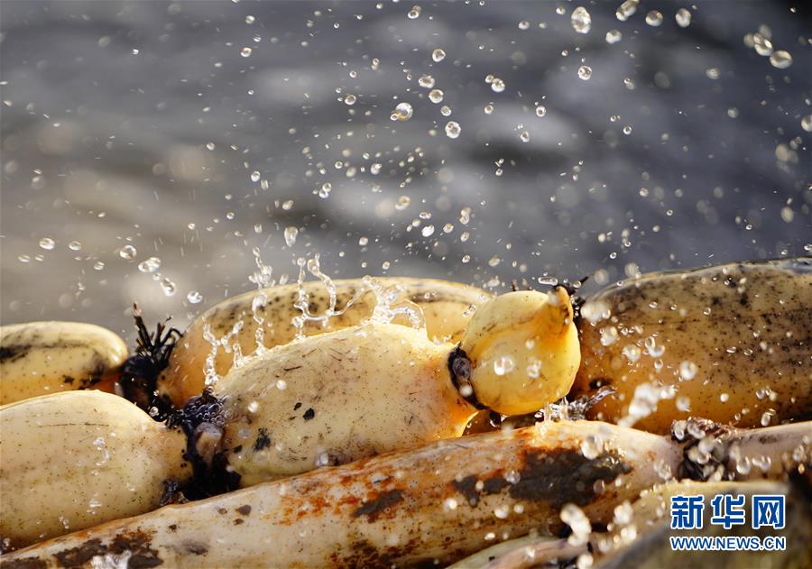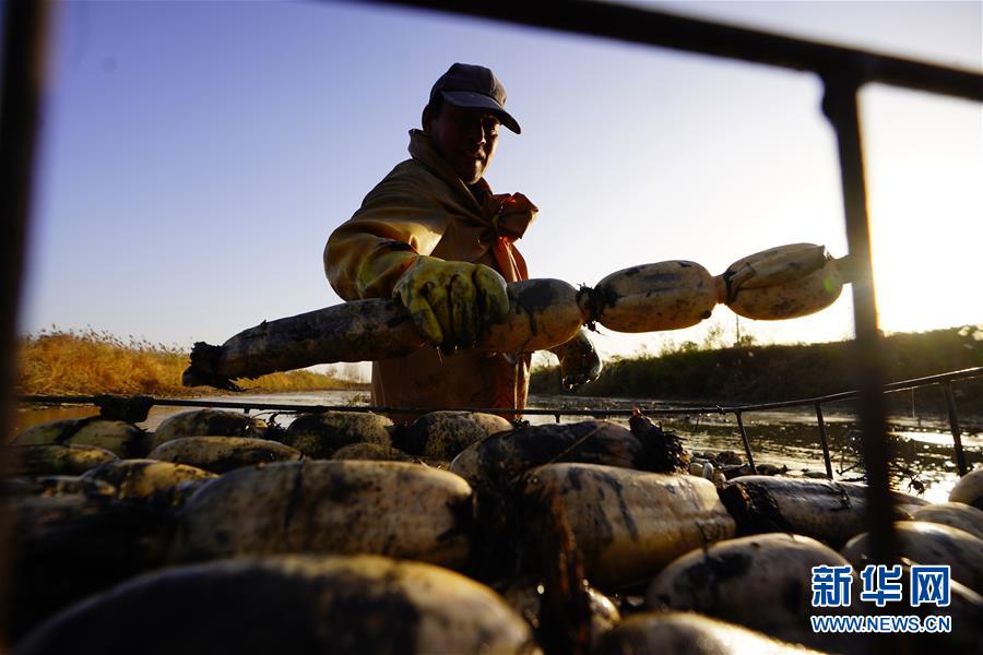 11月18日拍攝的蓮藕。初冬時(shí)節(jié),河北省唐山市曹妃甸蓮藕豐收,工人們?cè)诮Y(jié)冰之前忙著采收蓮藕。新華社記者邢廣利攝