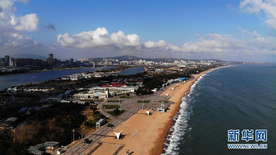 11月22日無人機(jī)拍攝的日照市萬平口海濱風(fēng)景區(qū)。山東省日照市萬平口海濱風(fēng)景區(qū)是當(dāng)?shù)芈糜蔚囊粡垺懊?,該景區(qū)憑借優(yōu)美的海灘、良好的水質(zhì)吸引了不少游客。新華社記者王凱攝