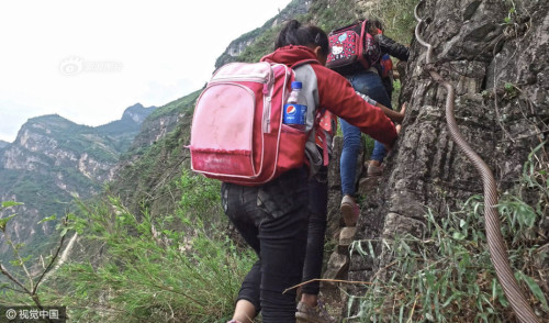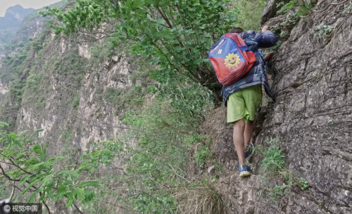 上學(xué)的孩子都背著沉沉的書(shū)包,大多數(shù)是女孩,15個(gè)孩子在三個(gè)家長(zhǎng)的保護(hù)下,大約用了2個(gè)小時(shí),到達(dá)“懸崖村”。上山容易下山難,遇到雨雪天氣,村里人就不再外出了。圖片來(lái)源:視覺(jué)中國(guó)