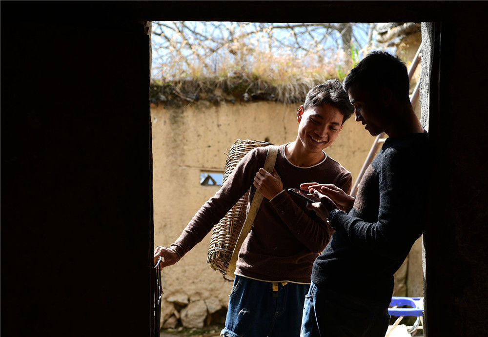 2019年11月16日,四川涼山,村里的年輕人一起交流購(gòu)物經(jīng)驗(yàn)。