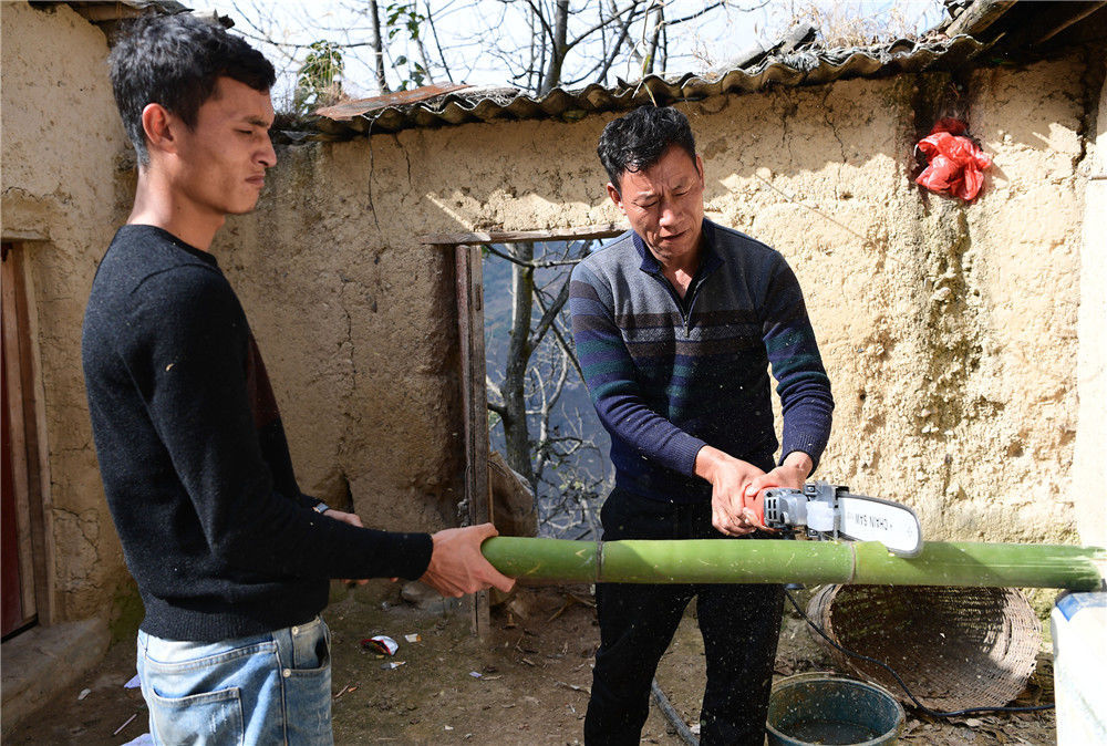 2019年11月16日,四川涼山,裝好電鋸后,楊陽(yáng)的父親某色蘇拉澤開始試用起來(lái)。