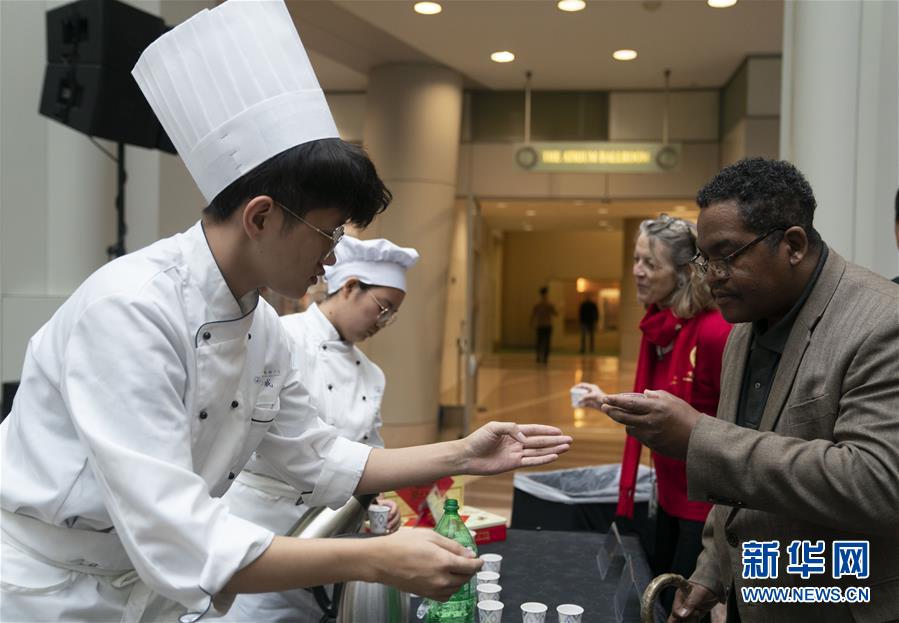 11月22日,在美國華盛頓,人們?cè)凇氨本┤铡蔽幕瘡R會(huì)活動(dòng)上品嘗中國小吃。作為中國北京和美國首都華盛頓締結(jié)友好城市35周年慶祝活動(dòng)的一部分,“北京日”文化廟會(huì)22日在華盛頓羅納德·里根大廈和國際貿(mào)易中心舉行。新華社記者劉杰攝