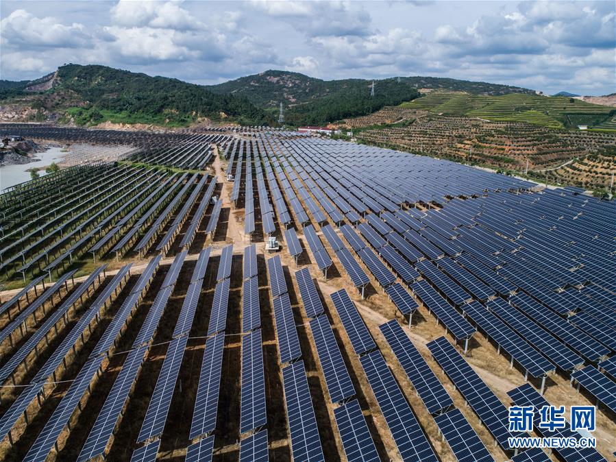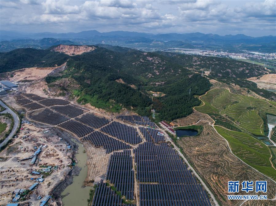 空中俯瞰湖州市埭溪鎮(zhèn)東紅村的光伏發(fā)電站(9月26日無人機拍攝)。該光伏電站占地2500多畝,是當?shù)貜U棄礦坑通過改造建成的“農(nóng)光互補”光伏發(fā)電站。