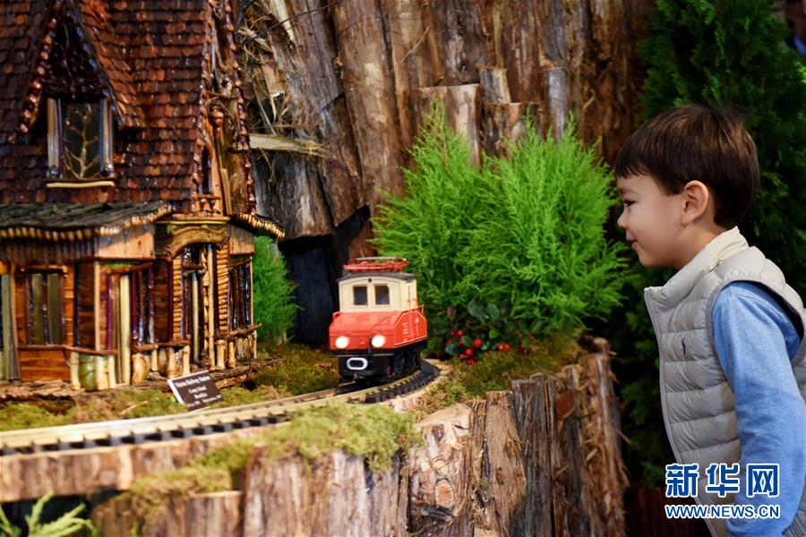 11月26日,在美國紐約植物園節(jié)日小火車展上,一名兒童觀察一輛模型小火車。新華社記者韓芳攝