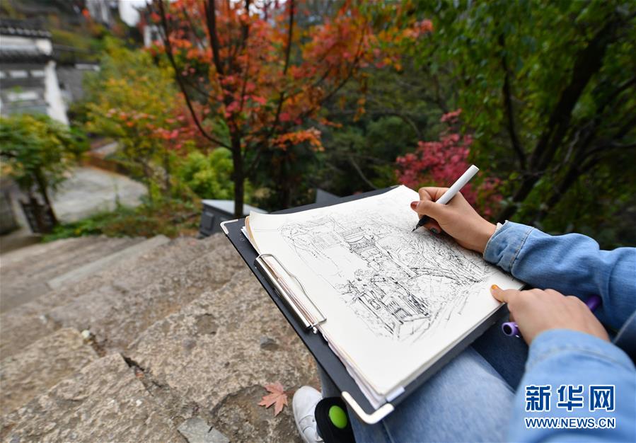 游客在婺源縣江灣鎮(zhèn)篁嶺村寫(xiě)生(11月7日攝)。新華社記者胡晨歡攝