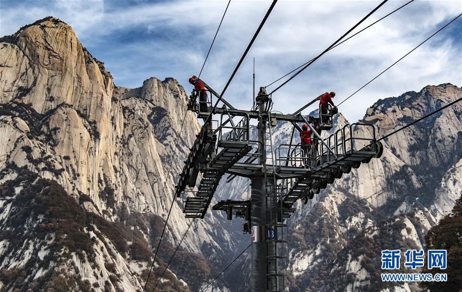 華山太華索道維修人員在進(jìn)行索道支架橫擔(dān)檢測(cè)(12月5日攝)。
