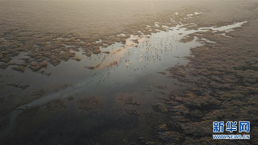 12月7日,一群候鳥(niǎo)在升金湖停留(無(wú)人機(jī)拍攝)。新華社記者張端攝