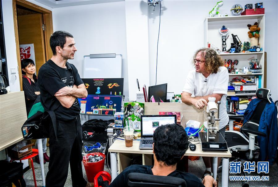 在深圳市福田區(qū)華強(qiáng)北一個(gè)創(chuàng)客孵化器內(nèi),來自荷蘭阿姆斯特丹的衛(wèi)國(右一)與來自不同國家的創(chuàng)客交流(2018年10月25日攝)。 新華社記者 毛思倩 攝