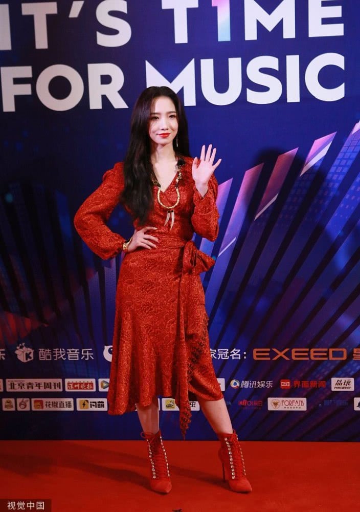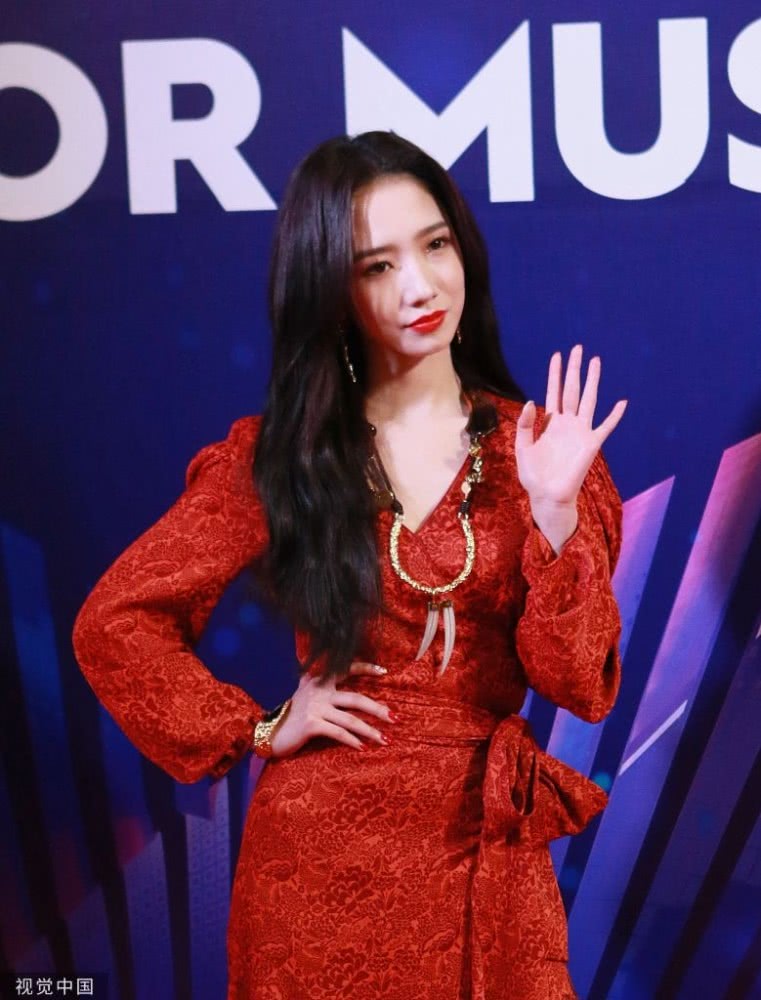 孟美岐身穿大紅色長裙搭配波浪卷發(fā),大走港風(fēng)美艷動人。