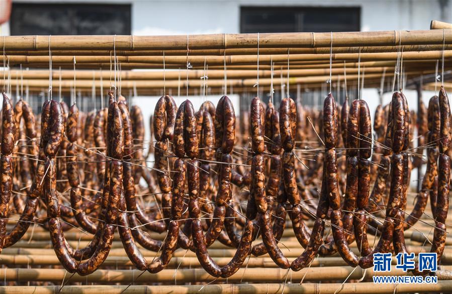 12月3日,安昌古鎮(zhèn)一家名為阿紅香腸的傳統(tǒng)臘味作坊里晾曬了各種手工制作的紹興臘味。新華社記者徐昱攝
