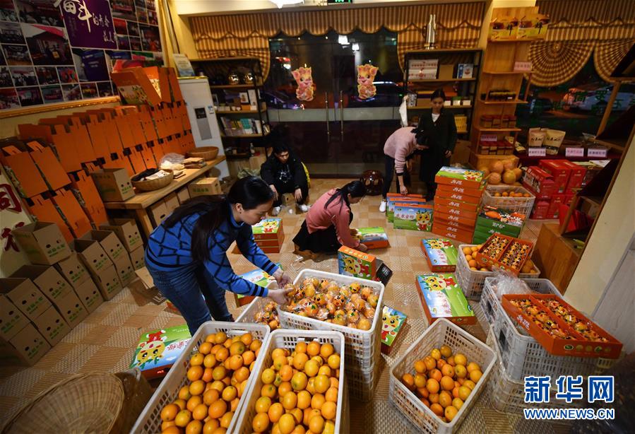 李柳萍(左一)和員工在特產(chǎn)館里包裝鹿寨蜜橙(12月13日攝)。新華社記者黃孝邦攝