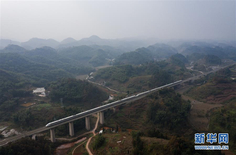 12月16日,一列動(dòng)車組列車從成貴高鐵鴨池河特大橋上駛過。新華社記者歐東衢攝