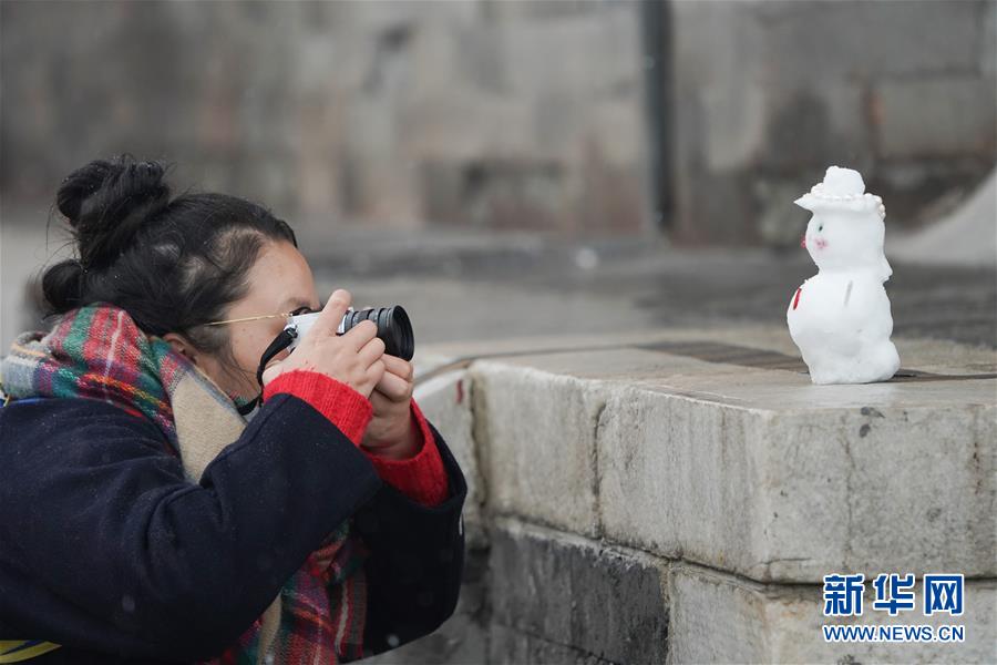 12月16日,在北京天壇公園,一名女士拍攝小雪人。當(dāng)日,北京迎來(lái)降雪天氣。新華社記者鞠煥宗攝