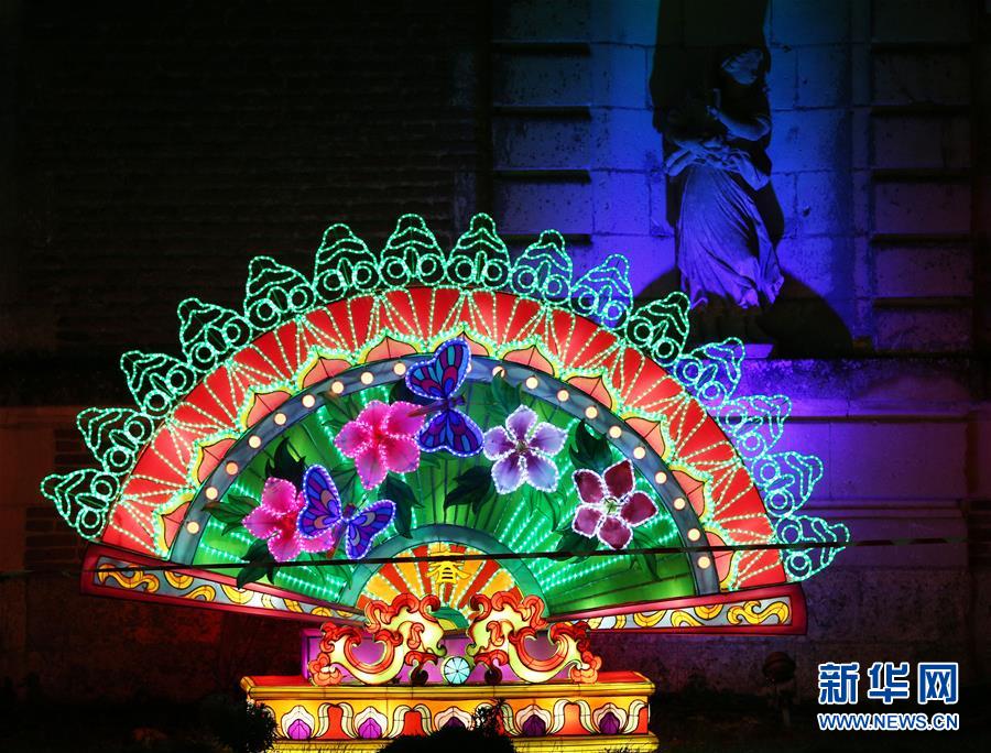 12月15日,在法國謝爾河畔塞勒市的塞納古堡,中國彩燈與城堡雕塑相得益彰。 新華社記者 高靜 攝