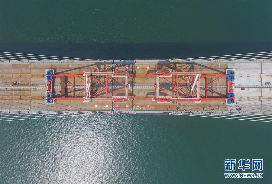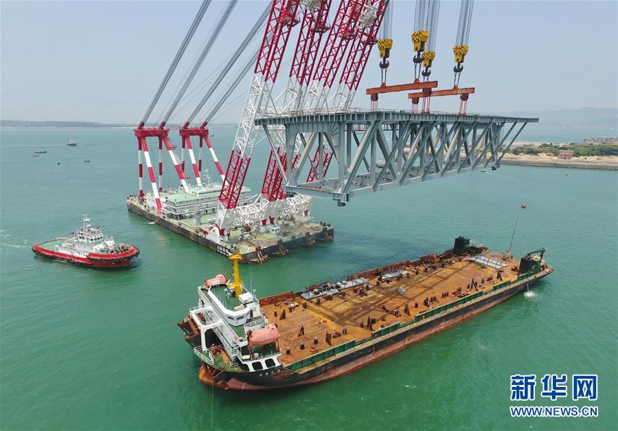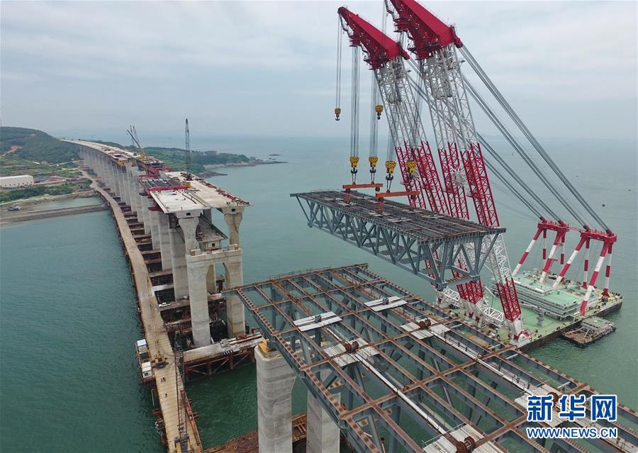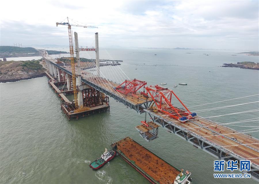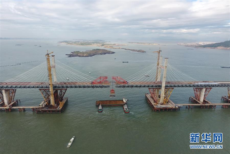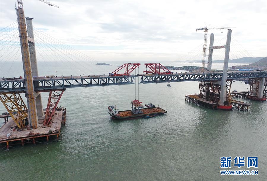 9月21日,平潭海峽公鐵大橋鼓嶼門(mén)航道橋的鋼桁梁在吊裝中(無(wú)人機(jī)拍攝)。9月25日上午,隨著一段長(zhǎng)17米、重473噸的鋼桁梁被精確固定到位,總長(zhǎng)16.34公里的平潭海峽公鐵大橋合龍貫通。平潭海峽公鐵大橋是福州至平潭鐵路控制性工程,也是“十三五”規(guī)劃中北京至臺(tái)灣高鐵的先期工程。大橋起于福州市長(zhǎng)樂(lè)區(qū),“踏”過(guò)四座小島后抵達(dá)中國(guó)第五大島平潭,上層設(shè)計(jì)為時(shí)速100公里的六車(chē)道高速公路,下層為設(shè)計(jì)時(shí)速200公里的高鐵。據(jù)福建福平鐵路公司介紹,大橋計(jì)劃2020年正式通車(chē)。在六年建設(shè)過(guò)程中,平潭海峽公鐵大橋所應(yīng)用研發(fā)的多項(xiàng)技術(shù)、裝備創(chuàng)下國(guó)內(nèi)外紀(jì)錄。新華社記者林善傳攝