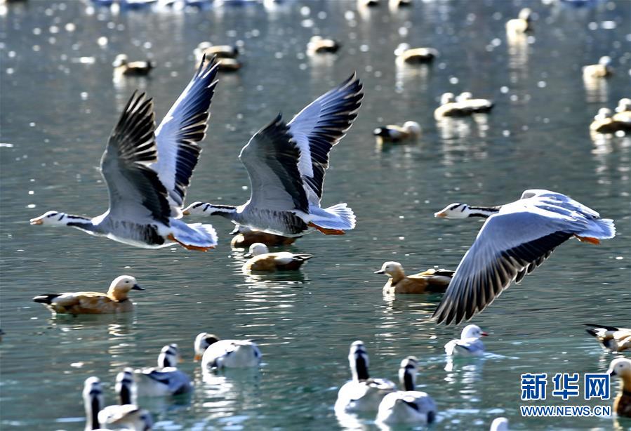 11月21日,候鳥在拉薩龍王潭公園水中嬉戲。時(shí)下,斑頭雁、紅嘴鷗等不少候鳥陸續(xù)飛抵拉薩河谷、雅魯藏布江沿岸等地避寒。新華社記者普布扎西攝
