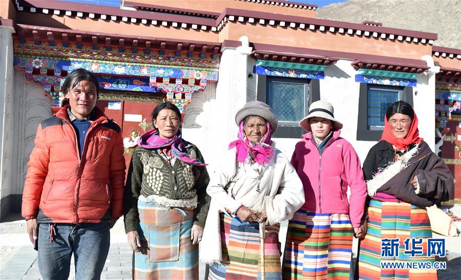12月23日,西藏那曲市雙湖縣80歲的牧民索朗德慶(中)與親戚在新家門口。新華社記者覺(jué)果攝