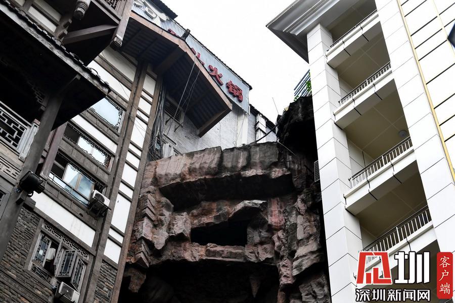 2019年10月24日,重慶渝中區(qū),兩棟樓房中間就是斷崖,斷崖上面是車來(lái)車往的滄白路,而下方則是人來(lái)人往的洪崖洞景區(qū),給人一種魔幻8D既視感,引發(fā)外地游客感嘆。