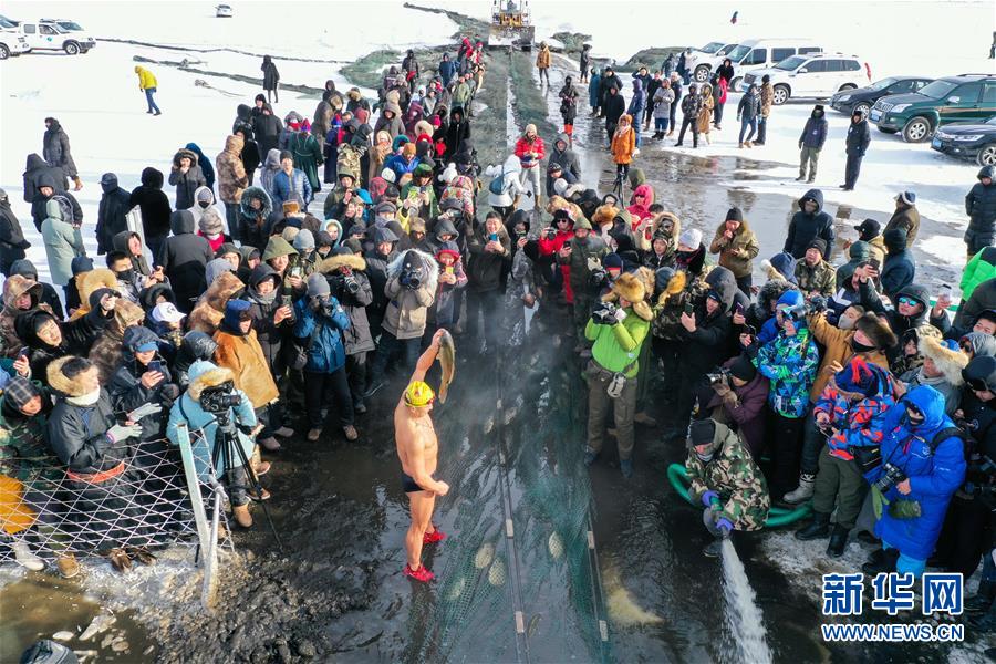 12月18日,一名冬泳愛好者展示冬捕魚(無(wú)人機(jī)拍攝)。新華社記者劉磊攝