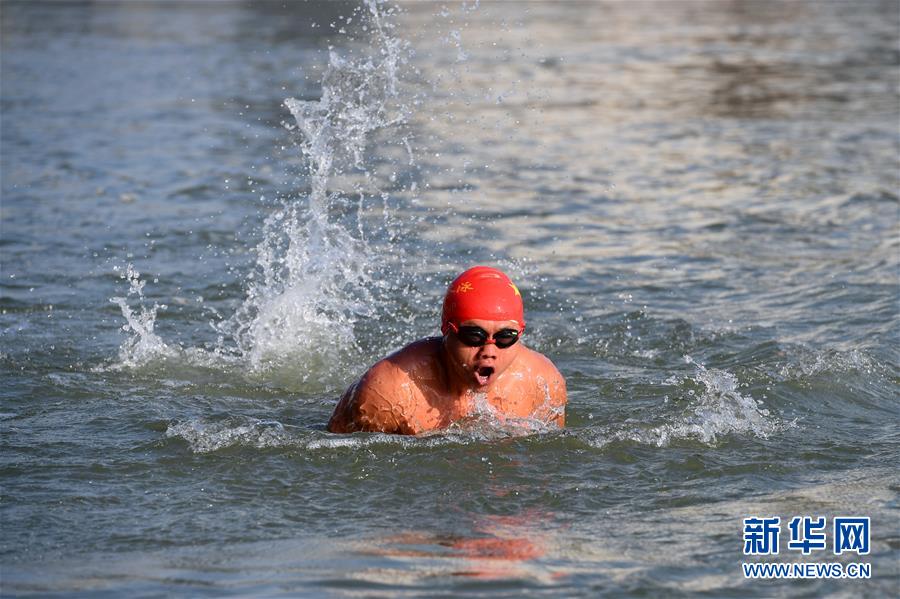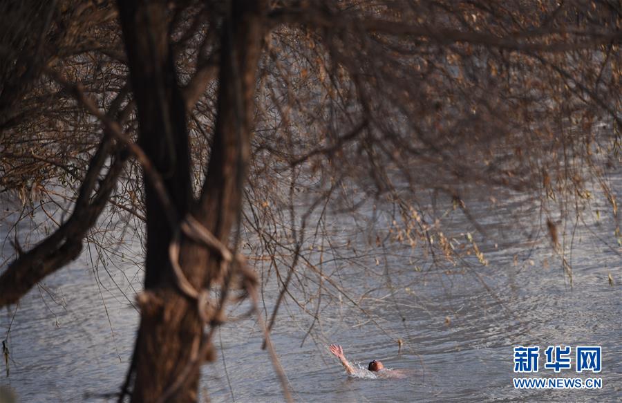 12月18日,冬泳愛(ài)好者趙西普在黃河冬泳。新華社記者陳斌攝
