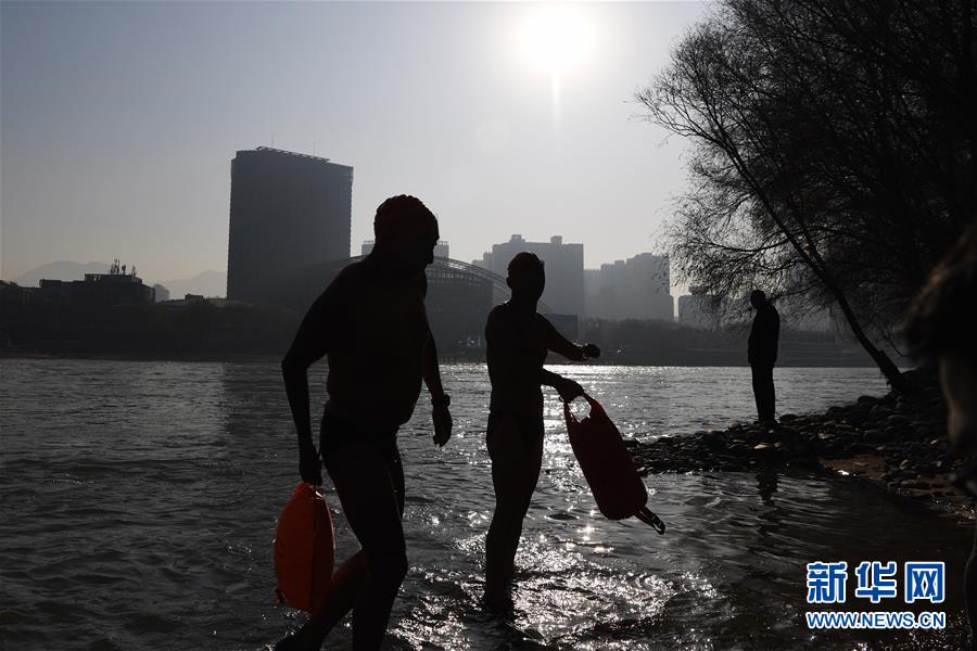 12月19日,在蘭州市馬拉松文化主題公園附近的黃河岸邊,冬泳愛(ài)好者入水準(zhǔn)備冬泳。新華社記者馬寧攝