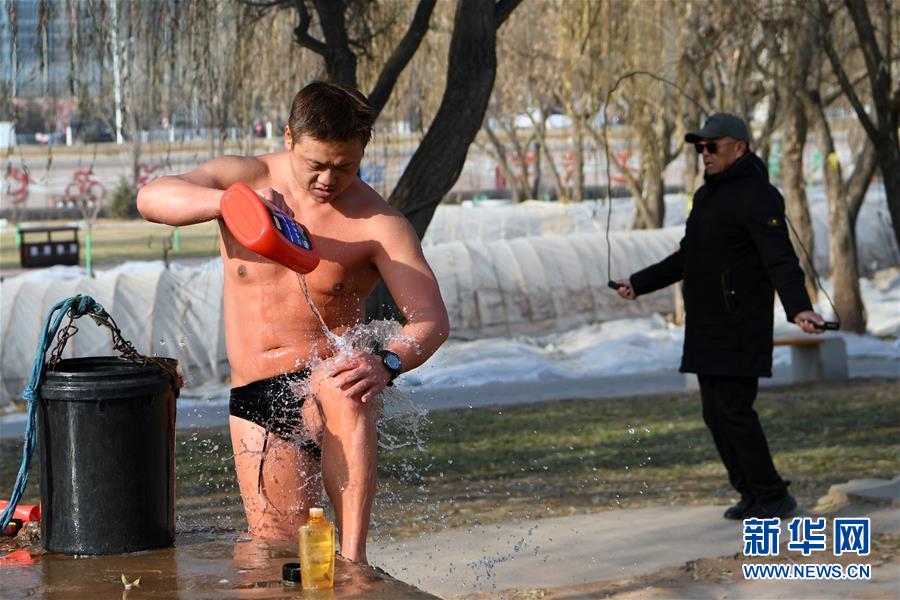 12月18日,冬泳愛(ài)好者李勇在上岸前向身上潑水。新華社記者陳斌攝