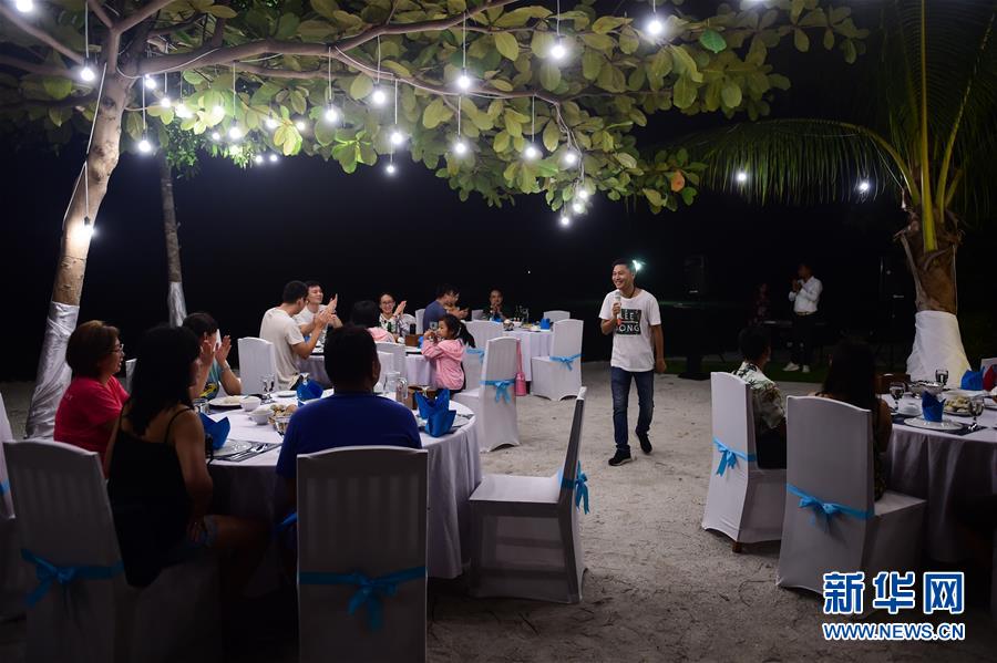 12月7日,在印度尼西亞邦加勿里洞省李王島,李嘉文在沙灘晚宴開始前向游客致辭。 新華社記者杜宇攝