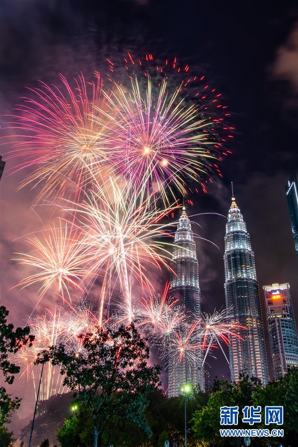 2020年1月1日,焰火在馬來西亞吉隆坡的馬來西亞國家石油公司雙塔旁綻放,迎接新年的到來。新華社記者朱煒攝