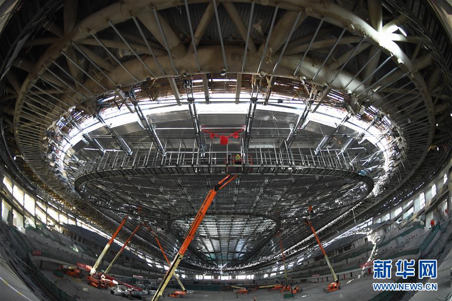 12月31日,施工人員在實(shí)現(xiàn)封頂封圍的國(guó)家速滑館施工現(xiàn)場(chǎng)工作。新華社記者鞠煥宗攝