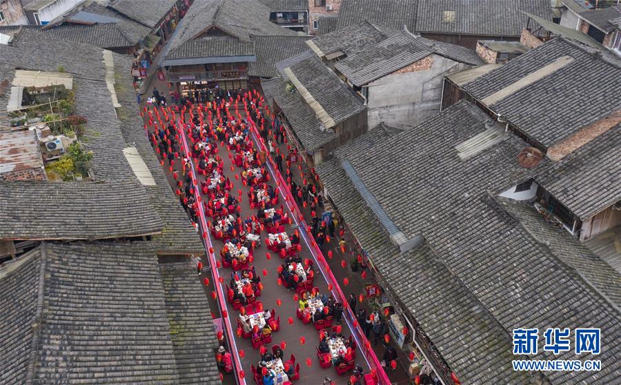 1月1日,在四川省雅安市上里古鎮(zhèn),人們?cè)谙碛媚曦i宴(無人機(jī)照片)。新華社記者 江宏景 攝