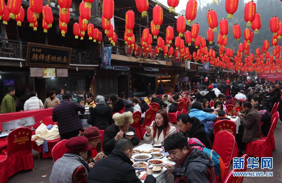 1月1日,在四川省雅安市上里古鎮(zhèn),人們?cè)谙碛媚曦i宴。新華社記者 江宏景 攝