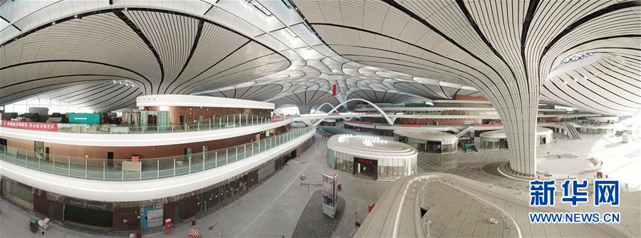 這是6月14日無人機(jī)拍攝的北京大興國際機(jī)場航站樓內(nèi)景(全景拼接照片)。新華社記者才揚(yáng)攝