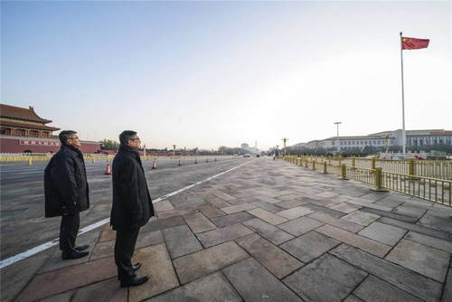 2019年12月7日,新任香港特區(qū)政府警務(wù)處處長鄧炳強(右)率香港警務(wù)處代表團來到北京天安門廣場,觀看升國旗儀式。新華社記者殷剛攝