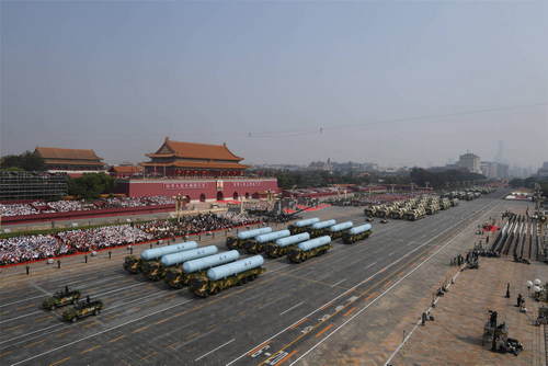 2019年10月1日,慶祝中華人民共和國成立70周年大會在北京天安門廣場隆重舉行。這是巨浪-2導彈方隊和東風-31甲改核導彈方隊接受檢閱。新華社記者翟健嵐攝