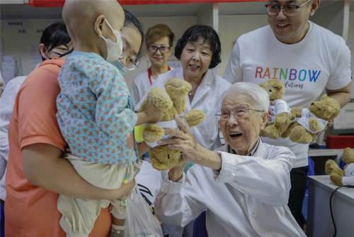 2019年5月31日,北京兒童醫(yī)院百歲兒科醫(yī)生張金哲(前右)在北京關(guān)愛惡性實(shí)體腫瘤患兒公益活動上向住院的孩子贈送兒童節(jié)禮物。新華社記者張玉薇攝