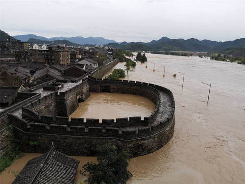2019年8月,超強(qiáng)臺(tái)風(fēng)“利奇馬”引發(fā)的洪水圍困浙江省臨海市。這是8月10日拍攝的被洪水圍困的臨海古城(無(wú)人機(jī)照片)。新華社發(fā)