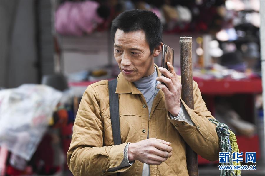 冉光輝接到一項(xiàng)搬運(yùn)業(yè)務(wù)的電話(1月5日攝)。新華社記者王全超攝