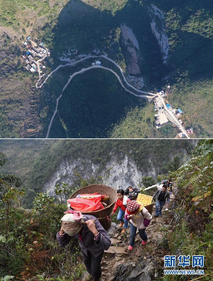 拼版照片:上圖為已經(jīng)修通水泥路的大化瑤族自治縣板升鄉(xiāng)八好村八好屯(2019年11月11日無人機(jī)拍攝);下圖為在尚未通路前,八好村八好屯村民背著年貨走山路回家(2016年1月26日攝)。新華社記者黃孝邦攝