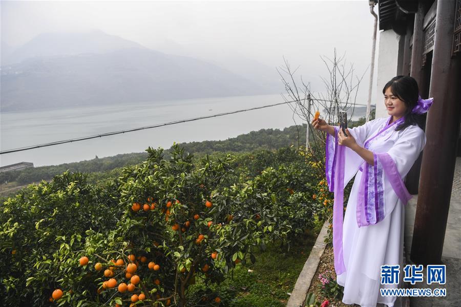 工作人員在重慶市奉節(jié)縣安坪鎮(zhèn)三坨村通過(guò)電商直播平臺(tái)推介臍橙產(chǎn)品(2019年12月28日攝)。新華社記者王全超攝