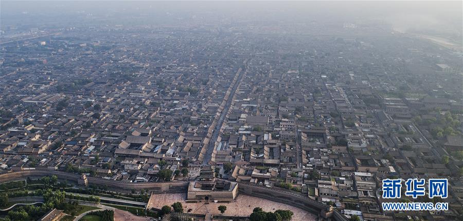 這是7月20日無人機從南門拍攝的平遙古城全景。鳥瞰平遙古城,形同一只欲行未動的烏龜,“龜”頭南尾北,上下東西四門比擬為龜之四足,故有“龜城”之說。
