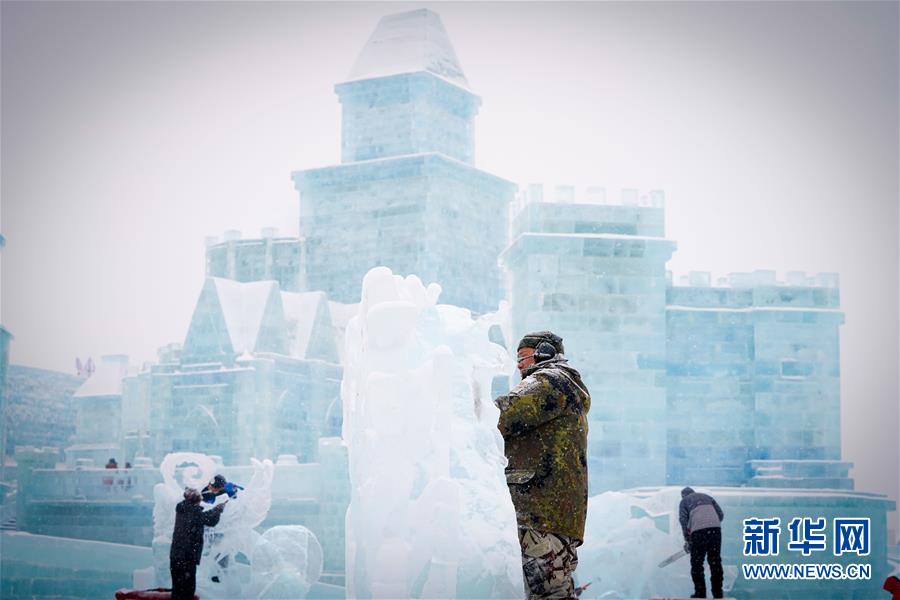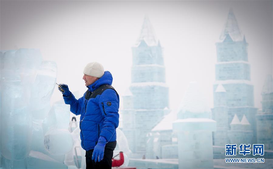 第九屆中國(guó)·哈爾濱國(guó)際組合冰雕比賽選手在哈爾濱冰雪大世界內(nèi)制作冰雕(1月2日攝)。新華社記者王松攝