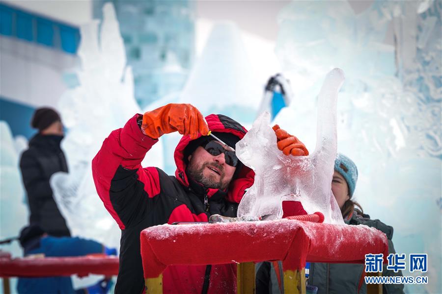 選手在第九屆中國(guó)·哈爾濱國(guó)際組合冰雕比賽中進(jìn)行冰雕創(chuàng)作(2019年12月31日攝)。新華社記者王松攝