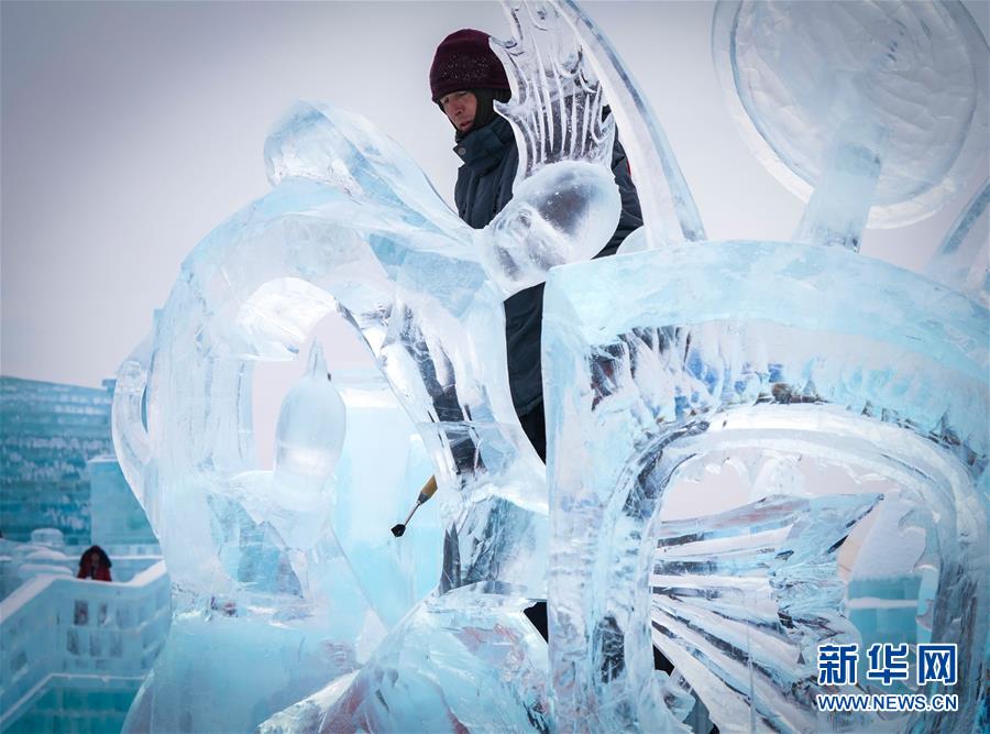 冰雕師在哈爾濱冰雪大世界內(nèi)雕刻冰雕作品(1月8日攝)。新華社記者王松攝