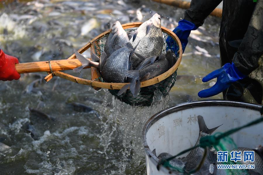12月28日,漁民們?cè)诹夂?zhèn)盛江家庭農(nóng)場(chǎng)捕魚。