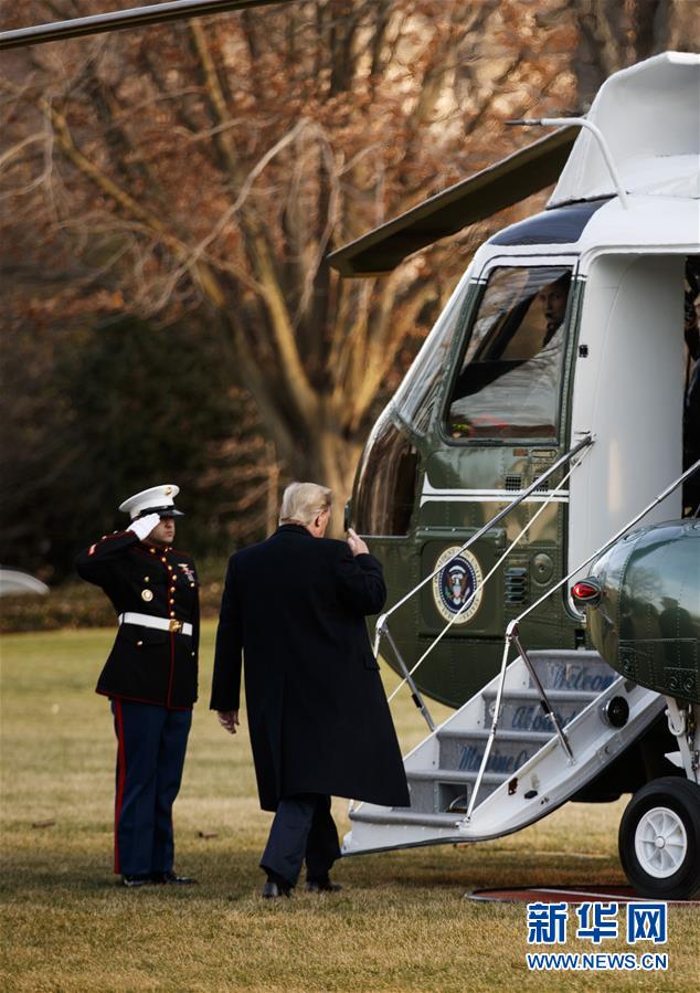 1月9日,在美國華盛頓的白宮南草坪,美國總統(tǒng)特朗普(右)準備登上直升機,前往俄亥俄州參加競選集會。