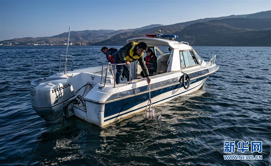 1月10日,云南省生態(tài)環(huán)境科學研究院的工作人員在撫仙湖取樣,進行月度水質(zhì)監(jiān)測。  新華社記者 江文耀 攝