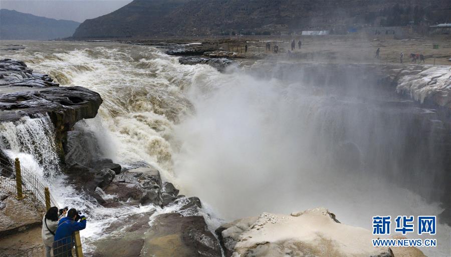 12月14日,游人在壺口瀑布景區(qū)拍照(無人機拍攝)。新華社記者陶明攝